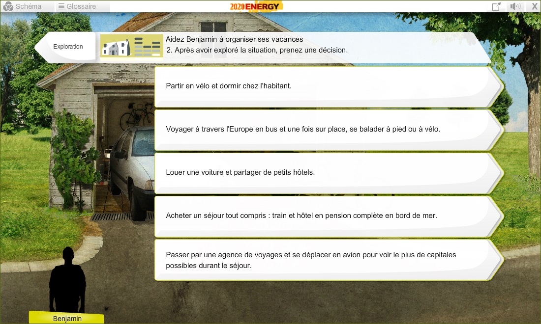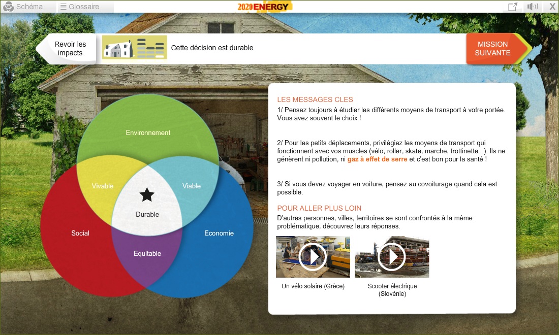 D'un point de vue gameplay, le jeu est en fait un simple quiz : une partie consiste à trouver la solution la plus équilibrée parmi plusieurs proposées, à un scénario donné (il faut compléter trois scénarios pour finir une partie). Ces scénarios correspondent à des situations très diverses, soulevant des questions environnementales, économiques et sociales qui représentent les trois critères auxquels il faut répondre. Pour donner la bonne réponse, des indices et des conseils sont donnés afin de pouvoir faire un choix réfléchi parmi les solutions proposées. Dans tous les cas, la meilleure réponse est celle qui satisfait aux trois critères. Du coup, le principe simple (simpliste ?) le rend très accessible, mais pas forcément immersif et passionnant. Le contenu est riche et les questions posés intéressantes car assez proches du quotidien de tout un chacun, mais il a au final peu d'impact à long terme.