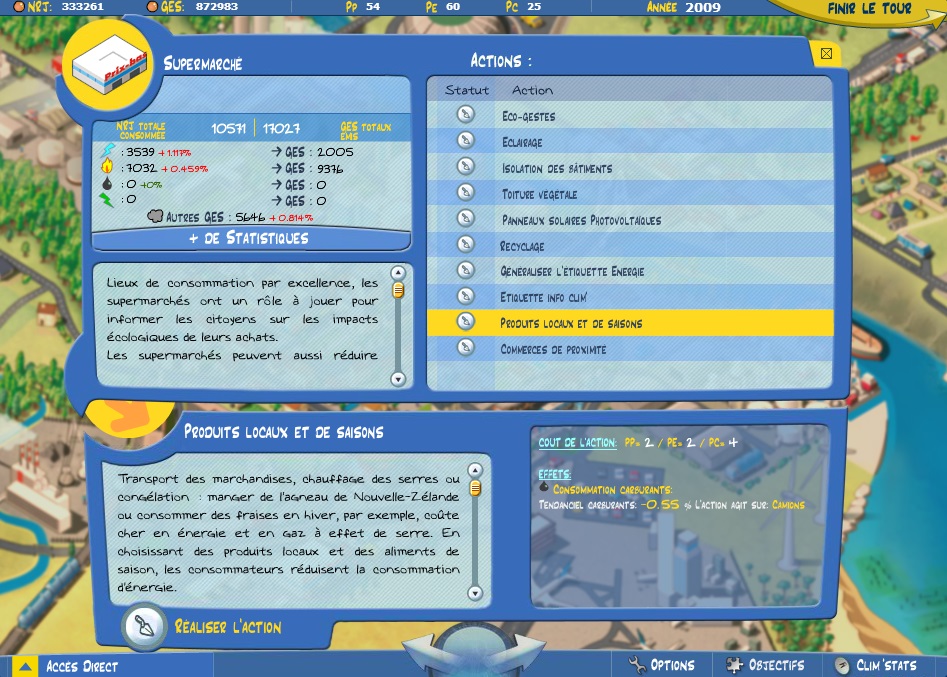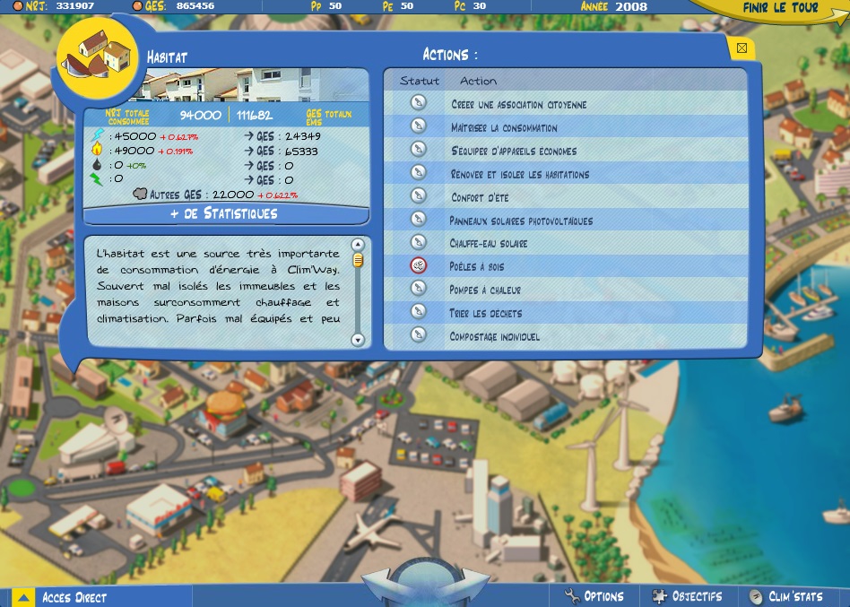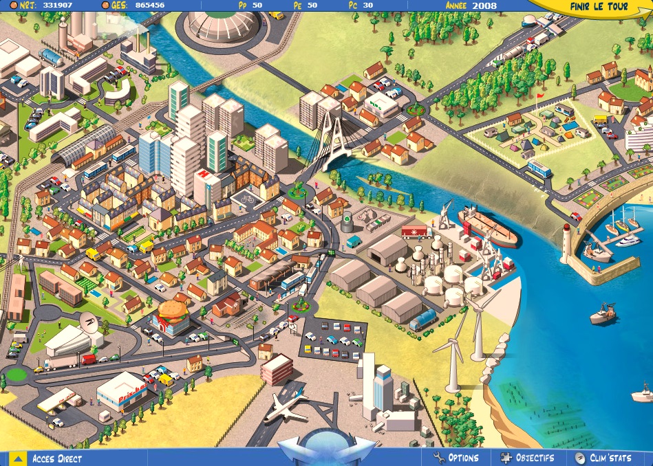 Jeu de simulation et de gestion de ville. Le joueur incarne le maire d'une ville et doit développer les infrastructures et services proposés pour satisfaire les citoyens tout en respectant l'environnement. Les actions possibles peuvent avoir des conséquences sur le long (voire le très long) terme. L'objectif est de réduire la consommation énergétique de la ville, ses émissions de gaz à effet de serre, et d'augmenter la part des énergies renouvelables. Comme dans tout bon jeu de gestion qui se respecte, on dispose d'un capital que l'on dépense à chaque tour de jeu (1 tour de jeu = 1 année). Au joueur de gérer correctement ce capital en prenant les bonnes décisions, sachant que le but est d'arriver à atteindre les objectifs en 50 ans maximum, soit 50 tours de jeu.