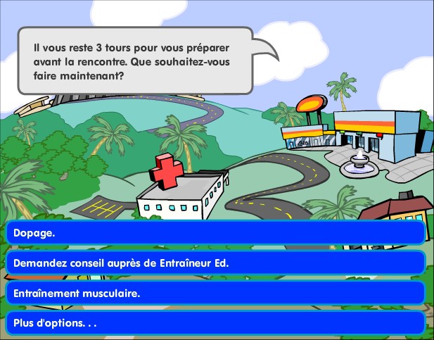Défi franc jeu est sans conteste un honnête petit logiciel proposant un contenu assez riche. Sans être un "foudre de guerre" visuel (le design est assez sommaire, et le style discutable), il a pour lui d'être simple d'accès et de proposer des objectifs clairs. La maniabilité des deux phases de jeu (gestion et course) est simple et correcte : la gestion se fait en cliquant à la souris, pour les courses, qui sont automatiques, il suffit de gérer les sauts en appuyant sur "espace" au bon moment. Tout juste pourrait-on lui reprocher cette trop grande simplicité, notamment lors des courses, mais elle permet de rendre le jeu très accessible. La partie "gestion de carrière" se révèle étonnamment riche ; elle aborde tous les aspects de la vie d'un sportif : nutrition, entraînement, dopage, repos, échange avec les amis/partenaires et même le petit boulot pour se payer de nouvelles chaussures ! Le scénario se permet même de poser un retournement de situation avec par exemple une blessure en cours de carrière, ouvrant des possibilités de choix concernant le dopage. Ces rebondissements amènent une variété bienvenue dans le cheminement du joueur, et sont d'un intérêt certain. De plus, ces rebondissements, couplés aux différents choix possibles, font que l'histoire évolue en fonction des choix du joueur, ce qui motive éventuellement d'autres parties afin de découvrir d'autres scénarios. Malheureusement, les choix proposés sont souvent terriblement manichéens, et manquent de subtilité ; du coup, faire une belle carrière est terriblement facile, pour peu que l'on ait le bon timing de saut lors des phases de courses. Le jeu est aussi entaché de temps en temps par des dialogues trop succincts et simplistes, et même quelquefois sans réelle valeur. Ce qui fait qu'au final, le jeu s'adresse plutôt aux plus jeunes, de par la simplicité du gameplay et des situations rencontrées. Ils trouveront avec Défi franc jeu une bonne sensibilisation au problème du dopage, et petit jeu sympathique qui se rejoue facilement, aussi bien pour tenter de battre ses scores à la course que pour explorer les différentes branches scénaristiques.