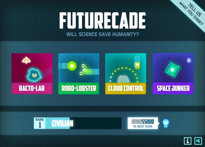 Jeu du Science Museum de Londres. 4 jeux d'arcade autour des sciences, comme un jeu de collecte d'objets avec une bactérie, ou la défense d'une ville grâce à des robots.