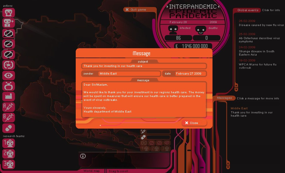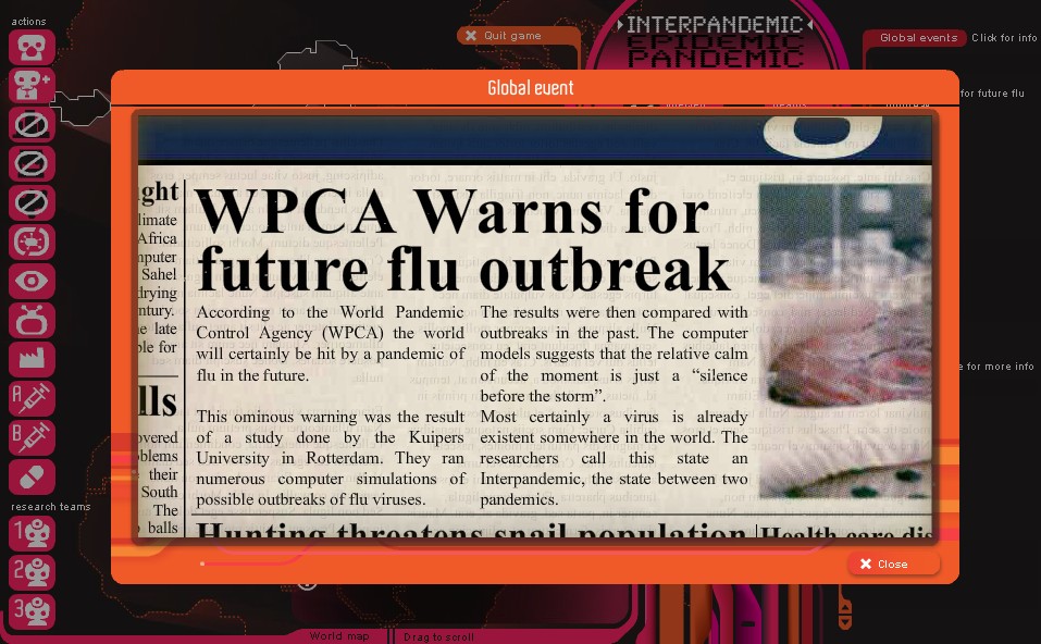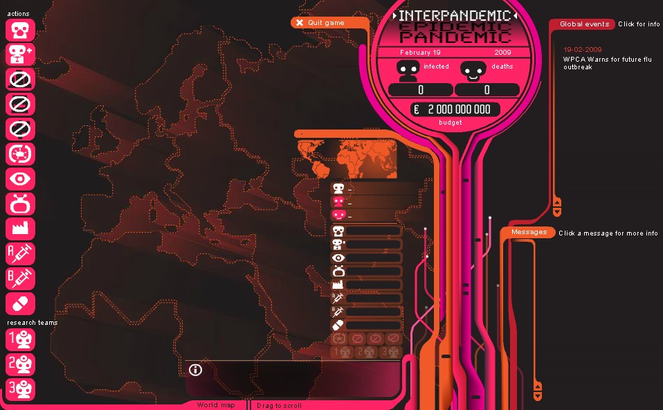 Vous incarnez l'OMS, et vous devez limiter la propagation d'un virus dans le monde. Le joueur doit gérer son budget pour prévenir une pandémie, informer les médias, effectuer des recherches curatives.