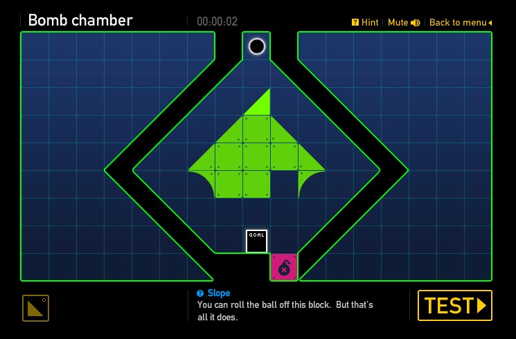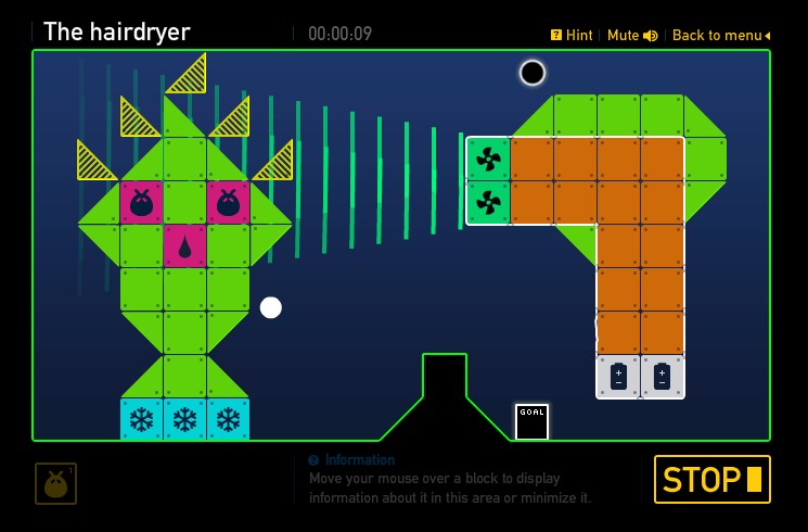 Jeu de puzzle autour de la physique. Le joueur doit résoudre des tableaux (amener une bille à la sortie) en la déplaçant indirectement avec des objets en rapport avec des notions physiques (aimant, ventilateur, ...).