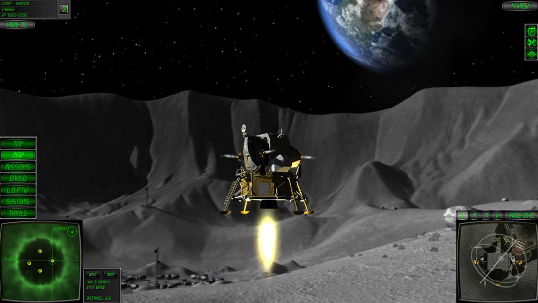 Simulateur de vol avec des modules lunaires. Le joueur est aux commandes d'un engin lunaire et doit effectuer des missions pour monter en grade et avoir de nouvelles responsabilités.