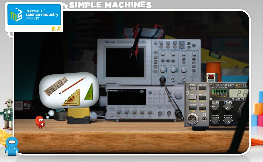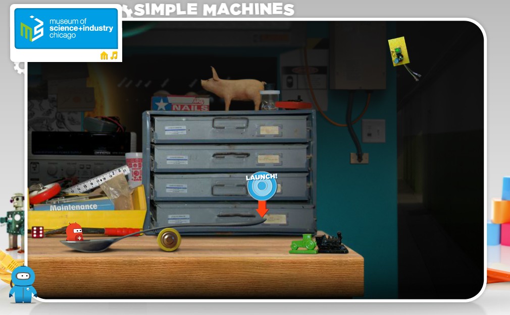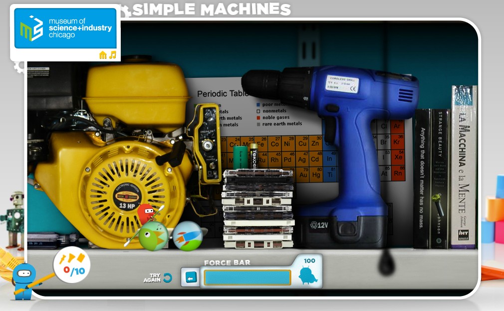 Sur le site du Museum of Science and Industry de Chicago. Simple machines est un petit jeu sur le thème de la mécanique ; le joueur doit aider Twitch, un petit robot, parti à la recherche d'objets. Pour l'aider dans sa quête, il faut résoudre de petites énigmes impliquant des mécanismes simples à utiliser (levier, poulie, etc.), le but étant d'utiliser ces mécanismes sans épuiser Twitch ; car en mécanique, on parle de force, et qui dit force, dit énergie...