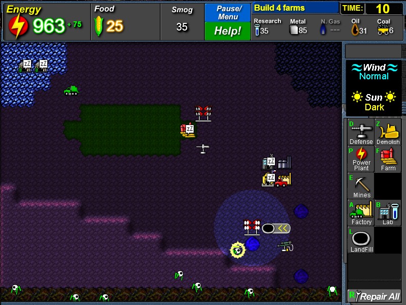 Qui a dit que les jeux sur le thème de l'écologie devaient être gentils, faciles, mous et 'propres sur eux' ? Super energy apocalypse (SEA) est le contraire ! Pour faire simple, la Terre est envahie les nuits par des monstres, et les humains doivent tout faire pour résister et survivre... Tout ? - oui, tout ai-je dit ! - mais alors, il faut aussi penser à faire en sorte de préserver les ressources de la planète et éviter un désastre écologique plus grave ! Dans ce jeu, il faudra jongler entre les différents moyens de production d'énergie disponibles (charbon, carburants issus de l'énergie fossile, centrales nucléaires, panneaux solaires, ...) pour se défendre contre les hordes d'ennemis qui viennent nous empêcher de dormir.