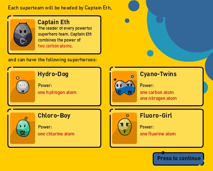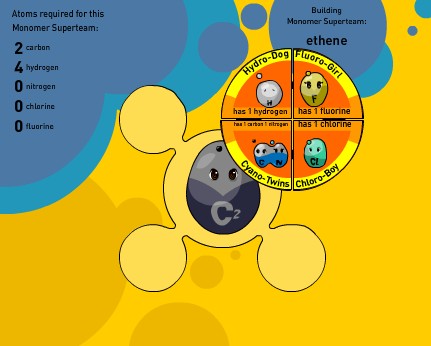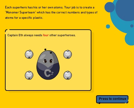 NB : un petit bug nécessite de faire un clic droit sur la fenêtre de jeu pour faire apparaître le curseur ! Très court et très simple, le jeu demande de créer des molécules en associant des atomes ; ces molécules sont à la base de chaînes de polymères, c'est-à-dire de matières plastiques que l'on utilise quotidiennement. Si le propos et les explications sont très claires, le jeu en lui-même est très guidé, ne laisse pas la place à l'expérimentation ; de ce fait, il perd beaucoup en intérêt et se rapproche plus de la démonstration interactive que du jeu.