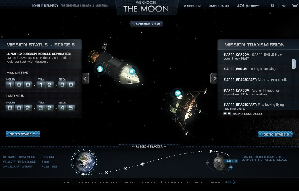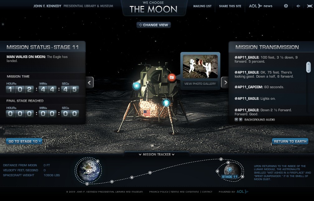 Film interactif retraçant la mission Apollo 11, du décollage de la fusée Saturn V à l'alunissage du LEM sur notre satellite. Cette excursion de la Terre à la Lune est grandement documenté en photos et vidéos de l'époque, et rend compte des différentes étapes du voyage.
