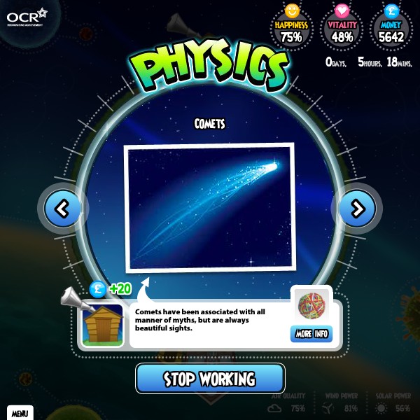 Ce jeu propose des encarts scientifiques pendant les phases où l'avatar travaille.