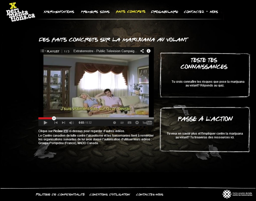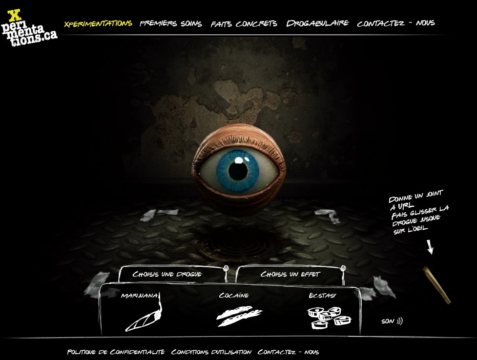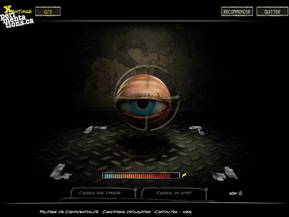 Application de sensibilisation aux effets de différentes drogues. Le but est de montrer des effets inattendus des drogues sur un personnage en forme d'oeil.