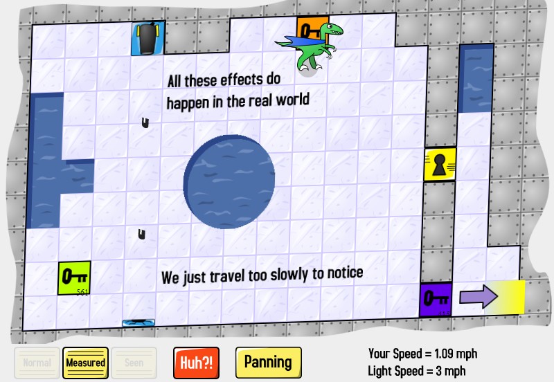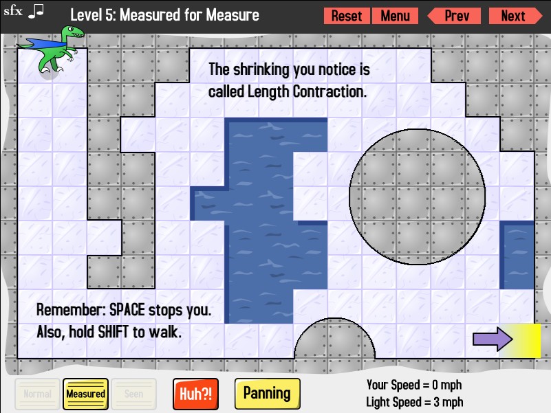 Dans Velocity raptor, le joueur incarne un raptor qui pénètre dans l'antre du Professeur Rex, dans le but de contrecarrer les plans de ce tyrannosaure peu avenant. Mais le Pr. Rex n'entend pas se laisser faire et il déclenche une machine faisant accélérer le raptor à la vitesse de la lumière. En cherchant un chemin pour s'échapper, le joueur va expérimenter les joies de la relativité.