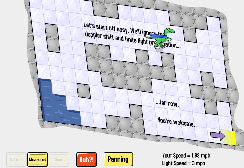 Au départ, Velocity Raptor se présente comme un jeu de labyrinthe tout simple : il faut trouver la sortie de chaque niveau. Le jeu se joue au clavier et les trois premiers niveaux dits "newtowniens" font office de tutoriel simple pour découvrir les commandes et l'inertie particulière du raptor que l'on contrôle. En effet, les tableaux sont tous recouverts de glace et notre ami saurien à une fâcheuse tendance à glisser... Mais le maniement est somme toute très simple et les trois premiers niveaux sont une formalité. Tout se complique quand le raptor passe à la vitesse de la lumière. Les concepteurs du jeu ont voulu rendre lisible à l'écran le principe einsteinien de la relativité qui veut que l'univers se déforme lorsque l'on approche cette vitesse. Du coup, chaque déplacement du dinosaure déforme l'écran de jeu et influe sur les éléments de chaque tableau. L'effet Doppler est même pris en compte : des clés permettant d'ouvrir les portes changent de couleur, suivant que le joueur s'en approche ou s'en éloigne. Le jeu propose ainsi une quarantaine de niveaux de plus en plus compliqués à traverser. Pour le joueur qui veut aller plus loin, un éditeur de niveaux est présent. En résulte un jeu étrange, non dénué de challenge. Pas très beau au premier abord mais très accessible dans son gameplay, le principe sur lequel il repose (la déformation des niveaux en fonction des déplacements) en fait une curiosité, ne serait-ce que pour voir une bonne idée au service d'un jeu. Une réserve, quand même : la question de la relativité est peu expliquée en cours de jeu et nécessite pour être bien comprise d'aller faire un tour dans une partie explicative annexe. Du coup, si le jeu est facilement accessible aux plus jeunes, les notions et le principe sur lesquels il repose ne sont pas si simples...