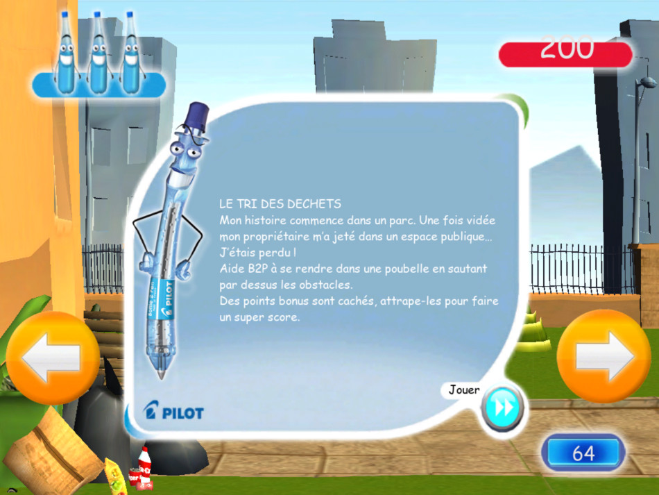 Pilot B2P est un jeu à vocation commerciale, demandant au joueur de guider une bouteille en plastique à travers les 6 étapes de son recyclage, dans le but de la transformer en stylo de la marque éditant le jeu. Au cours du jeu, les étapes de la transformation sont explicitées afin de sensibiliser le joueur au recyclage des déchets.