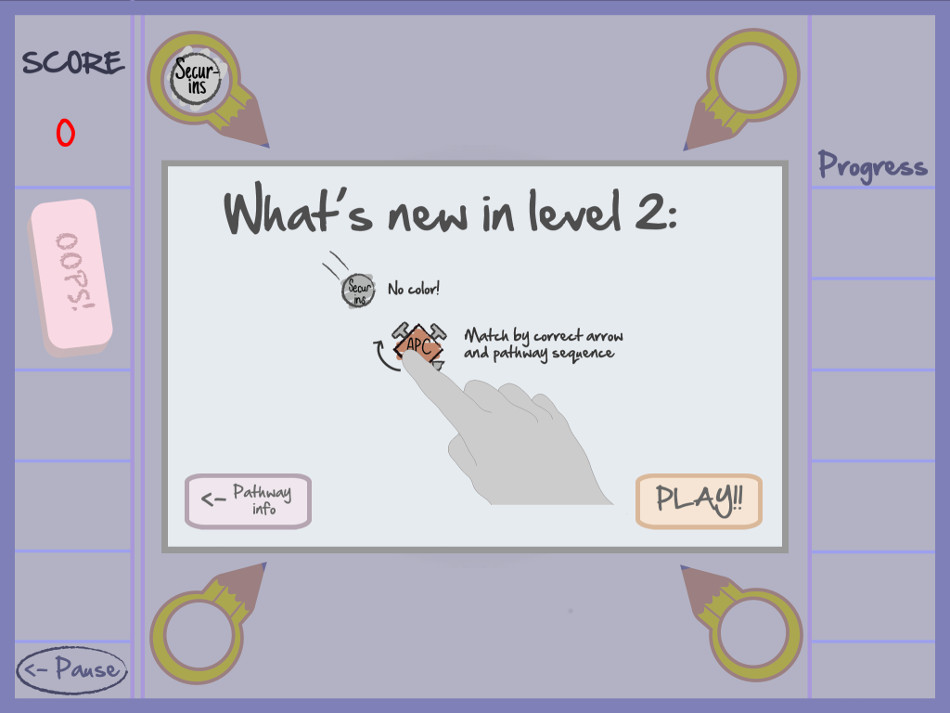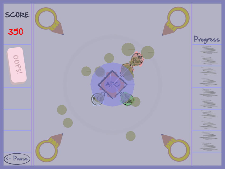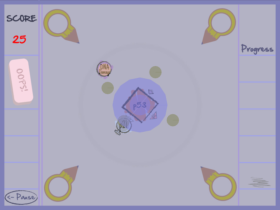 Pas très beau, Cancer Avenger a pour lui d'être très simple dans son gameplay : on oriente un noyau moléculaire au centre de l'image pour attraper les molécules qui arrivent des quatre coins de l'écran. Le principe de devoir créer des chaînes à partir de ce noyau est assez simple en soi, mais dans les faits, le jeu se révèle assez obscur : les molécules qui arrivent portent des appellations qui ne parlent pas au béotien. S-CDk, Bax, p21, Cyt. C sont par exemple les molécules que l'on doit rattacher au noyau p53 ; autant vous dire qu'il va falloir réviser ses cours de biologie ! Pourtant, le jeu se veut pédagogique, et propose une explication avant chaque niveau de l'intérêt/importance de l'action qui va être engagée lorsque le joueur aura appuyé sur "start". Une fois lancé, le jeu reste peu clair : difficile de savoir de quel côté attacher telle ou telle molécule. Du coup, on tâtonne, on essaye ; on finit par réussir avec un peu de persévérance et beaucoup de hasard ; la faute au manque de clarté dans le contenu qui ne parle pas vraiment aux débutants en cancérologie, mais aussi aux visuels, qui manquent de clarté. Au final, nous avons là un sujet certainement très intéressant sur le fond, mais très abscons dans la forme.