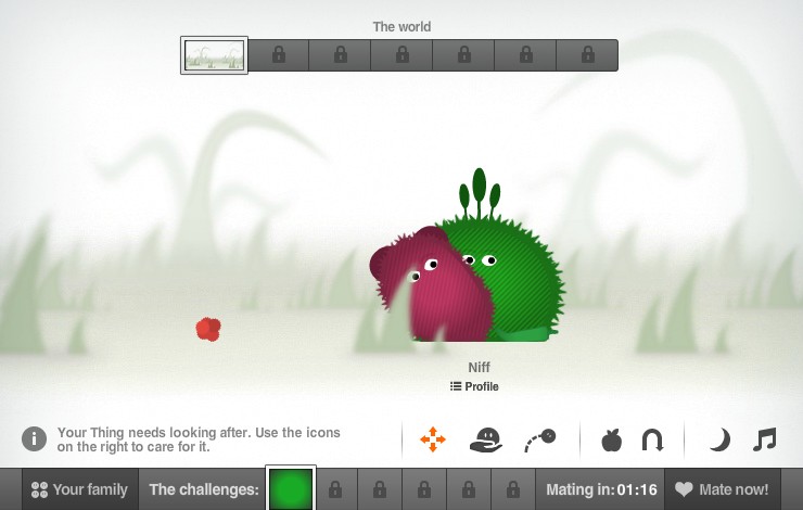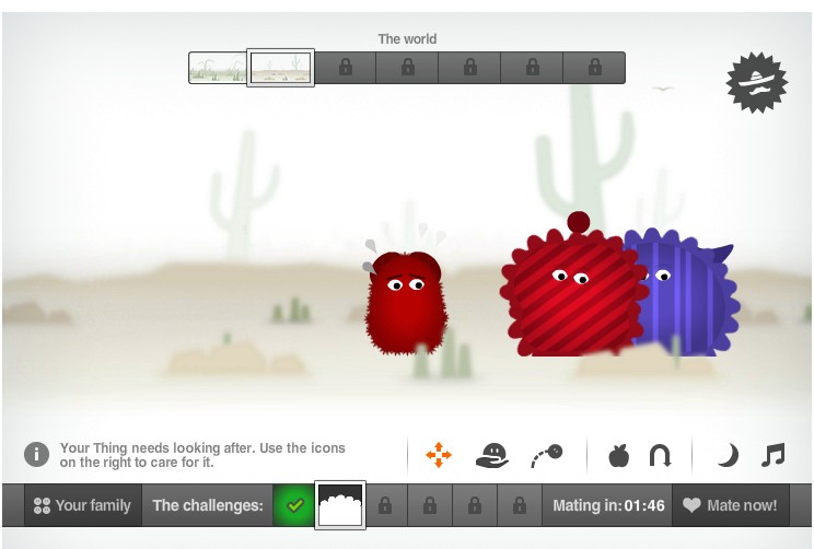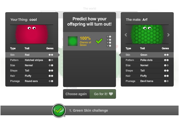 Proposé par le Science Museum de Londres, Welcome to Thingdom est un petit jeu sympathique qui fait penser au Tamagotchi, jeu électronique dans lequel on élève une créature virtuelle. Car ici aussi, on peut nourrir son Thing, le faire bouger, sauter, danser et dormir entre autres choses. Mais cette partie du jeu ne dure qu'un temps et on peut même l'écourter. Vient alors le moment où l'on doit accoupler notre Thing : comme le jeu pose des critères à chaque niveau (par exemple, obtenir un nouveau Thing ayant une couleur ou une forme précise), le choix du partenaire est en principe important. Dans les faits, le jeu aide beaucoup le joueur en insistant sur les caractéristiques des partenaires et en indiquant au joueur les probabilités d'obtenir la bonne créature avec chaque partenaire possible. Pour l'anecdote, il faut savoir que choisir un partenaire ne suffit pas : il faut aussi "charmer" celui-ci ! Un mini-jeu de réflexe s'ouvre alors, dans lequel le joueur doit faire le meilleur score possible afin de séduire le partenaire de son Thing... Visuellement charmant, Welcome to Thingdom est un jeu sympathique qui met bien en avant les notions de génétique sur lesquelles il est basé. Un bémol toutefois : le jeu est vraiment très simple et s'adresse surtout aux plus jeunes. Le challenge est peu présent de par le fait que le jeu accompagne le joueur en permanence et que l'échec n'existe pas : on peut créer les créatures que l'on veut à l'envi.