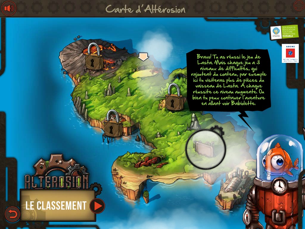 Donc, le message écologique est bien présent, et le gameplay au diapason. Mais le joueur avide de sensations attend plus qu'un message, et la question de l'intérêt se présente. Ici, point de tergiversations : Alterosion accroche immédiatement. La première chose qui frappe, c'est l'univers proposé, mêlant steampunk et fantastique, illustré par de belles images. Les personnages que l'on croise sont très sympathiques et bien contruits : il en résulte des dialogues et des situations cocasses et drôles, qui rendent l'aventure légère et agréable. Le tout est parfaitement orchestré par une réalisation sans faille, qui présente le déroulé des événements de manière dynamique, un peu à la façon d'une bande dessinée dont on tournerait les pages. Tout cela participe à la bonne ambiance qui se dégage du jeu, et on avance dans le scénario parce que l'on veut découvrir de nouveaux personnages, voir de nouvelles situations et découvrir la fin. La grande force de ce serious game est là : si le message écologique est important, Alterosion n'oublie pas d'être avant tout un jeu et de proposer une belle aventure.